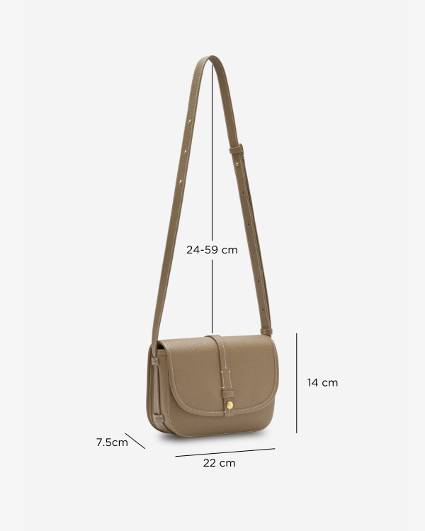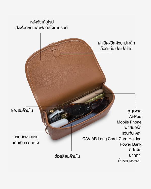 มีขนาดที่เหมาะกับยุคนี้ ฐานยาว 22 cm ใส่สมุดโน้ต A5 พาสปอร์ต มือถือ ธนบัตร กุญแจรถ แป้งพัฟ ทิชชู่เล็ก และ Airpod เก็บของสำคัญได้ครบ สายสะพายเส้นเดียว ปรับสั้นยาวได้ เลือกได้ว่าจะปล่อยสายออกข้างนอก หรือเก็บปลายไว้ในกระเป๋า ไม่เกะกะ