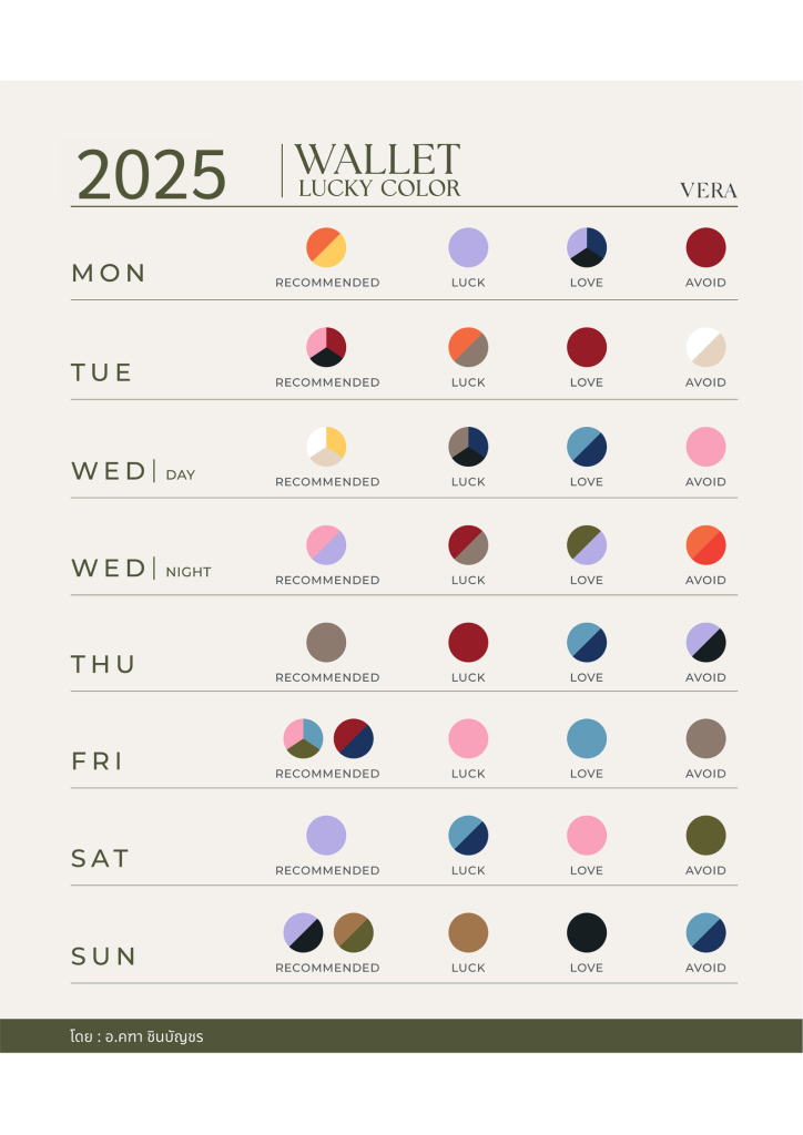 For 2025, VERA collaborated with Thailand’s renowned astrologer, Ajarn Katha Chinabanchorn, to create this special “Wallet Lucky Color Chart”, tailored to your day of birth.