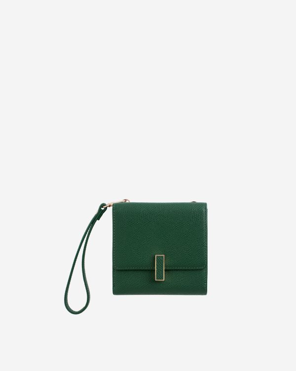 กระเป๋าสตางค์แบบพับ 3 ทบ พร้อมช่องเก็บเหรียญและพร้อมสายคล้องมือ (ถอดได้) และสามารถสะพายแบบ Crossbody ได้ด้วยสายโซ่ (ซื้อเพิ่มในราคาพิเศษ)